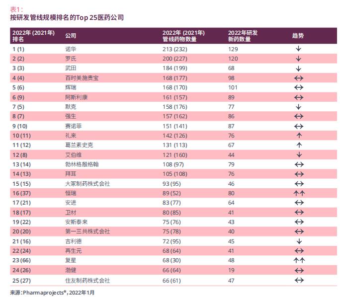 值提及的是,中国药企首次闯入顶级TOP25药企排行榜中,成为中国医药研发历史上的一个里程碑时刻。恒瑞从去年第37名飙升至第16名,复星则从2021年的第66位上升43个名次,位列第22名。“与恒瑞自主研发不同的是,复星药物管线的增加主要依靠引进合作伙伴的药物技术,包括引进BioNTechSE的mRNA新冠疫苗技术”,Pharmaprojects的高级总监Ian Lloyd在《2022年医药研发趋势年度分析》中指出。