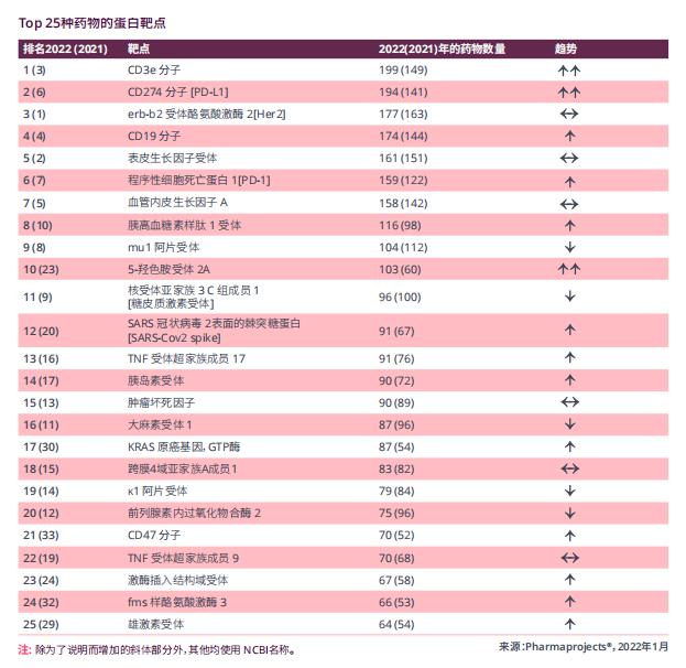 2022年Top25药物的蛋白靶点榜首为CD3E,其取代了连续两年夺魁的HER2,药物数量从2021年的149种增长到199种。而其同类PD-1的管线也在扩增。