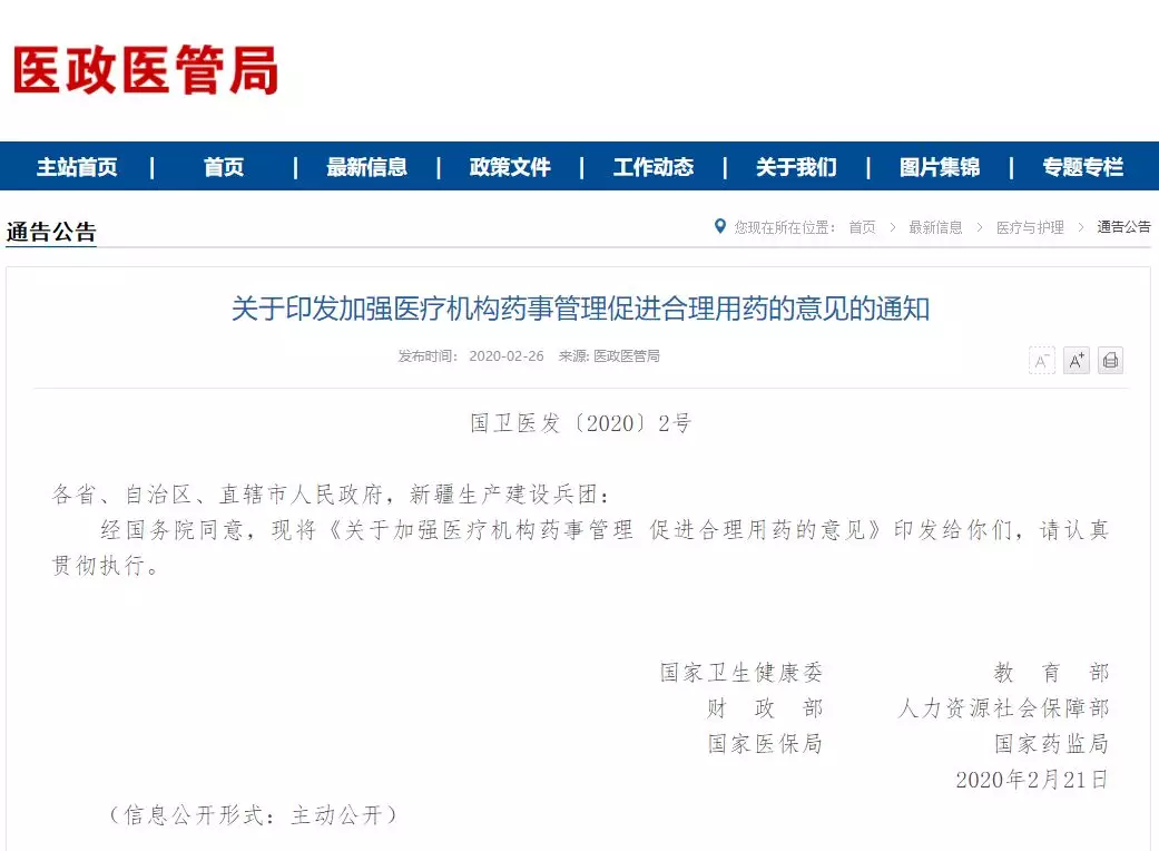 2月26日,国家卫健委、国家医保局、国家药监局等六部委联合印发《加强医疗机构药事管理促进合理用药的意见的通知》明确,加强医疗卫生服务综合监管的重要举措。